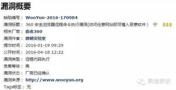 然而,还有一个事实是乌云在今天早上发布了360浏览器的高危安全漏洞,请注意文章开头,补天是360旗下的,事情似乎又神奇了些: